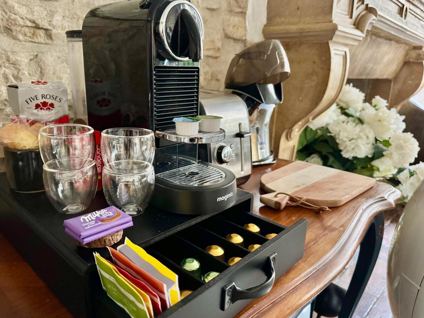 Shared stationery such as printed menus, magazines, pens, and paper removed