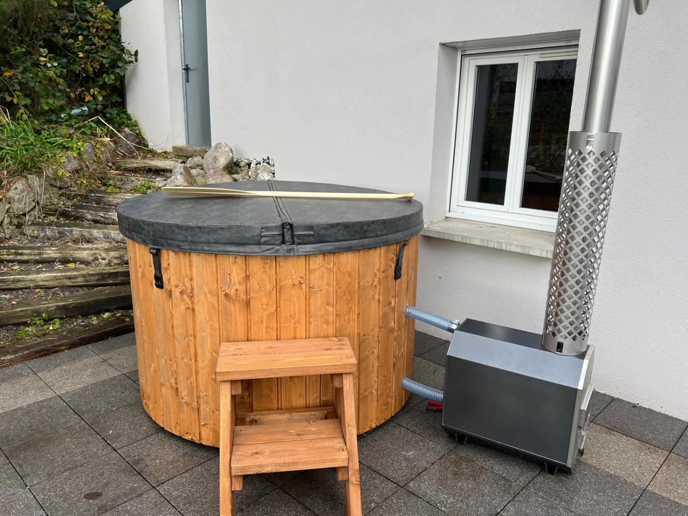 Two-Bedroom House. Guests will have a special experience as this holiday home features a hot tub and a fireplace. This spacious holiday home is comprised of 1 living room, 2 separate bedrooms and 1 bathroom with a walk-in shower and a bath. Guests can make meals in the kitchen that comes with a stovetop, a refrigerator, a dishwasher and an oven. Featuring a terrace with garden views, this holiday home also offers a washing machine and a flat-screen TV. The unit offers 3 beds.